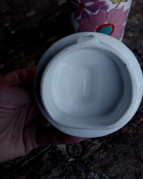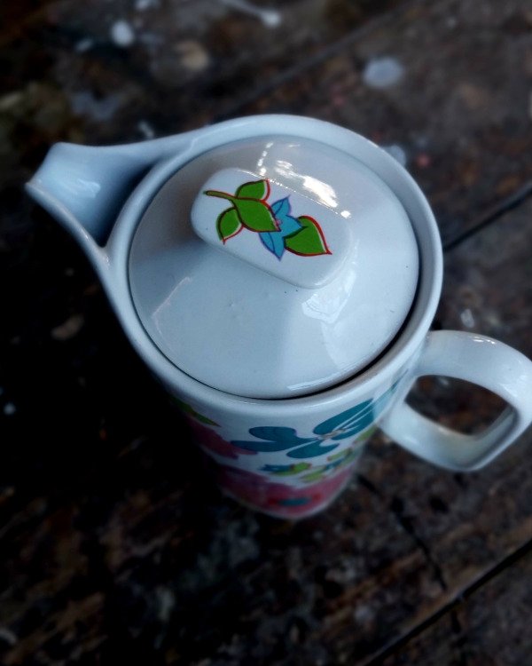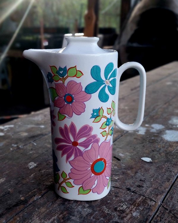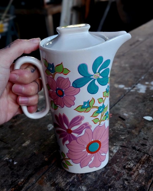 Antigua Cafetera Lozadur Festival Flores rosas, lilas y turquesas.