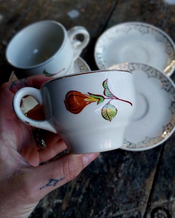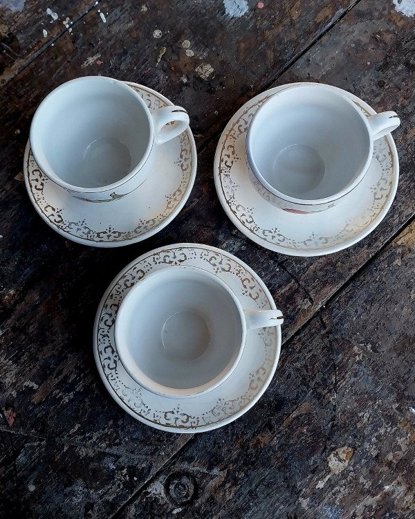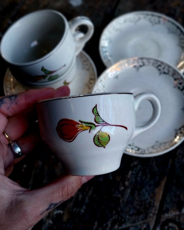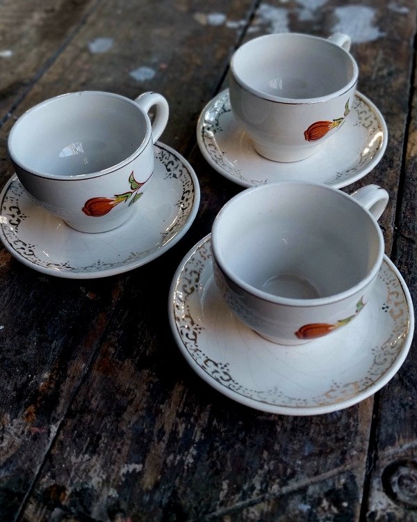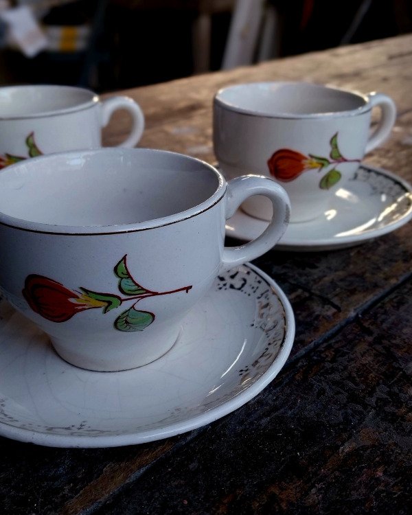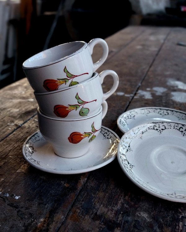 3 tazas con ilustración de flor y 3 platitos. Combinación hecha por nosotros.