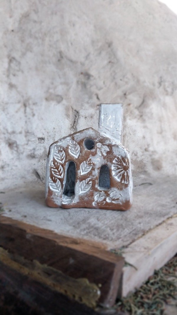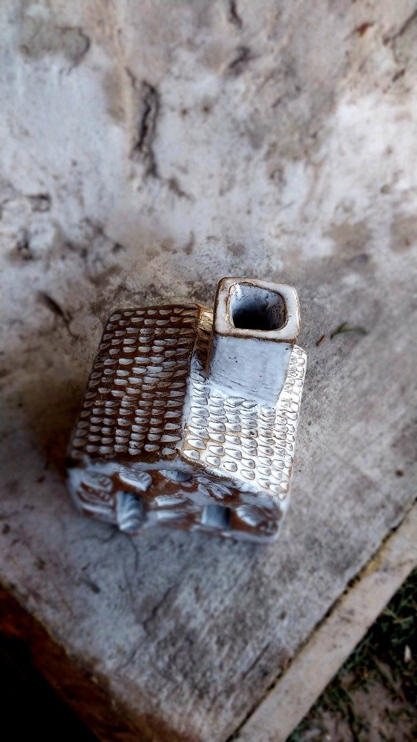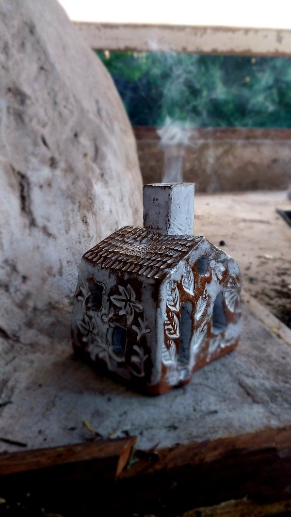 Casita sahumadora hecha en gres. Trae un pequeño platito para apoyar los conitos.