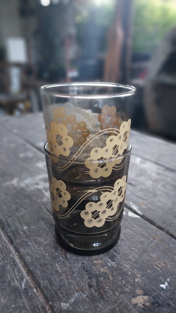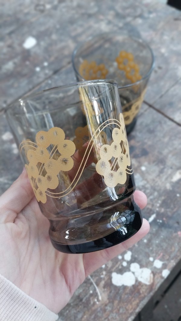 Par de vasos en vidrio marrón y dibujo flores beige.